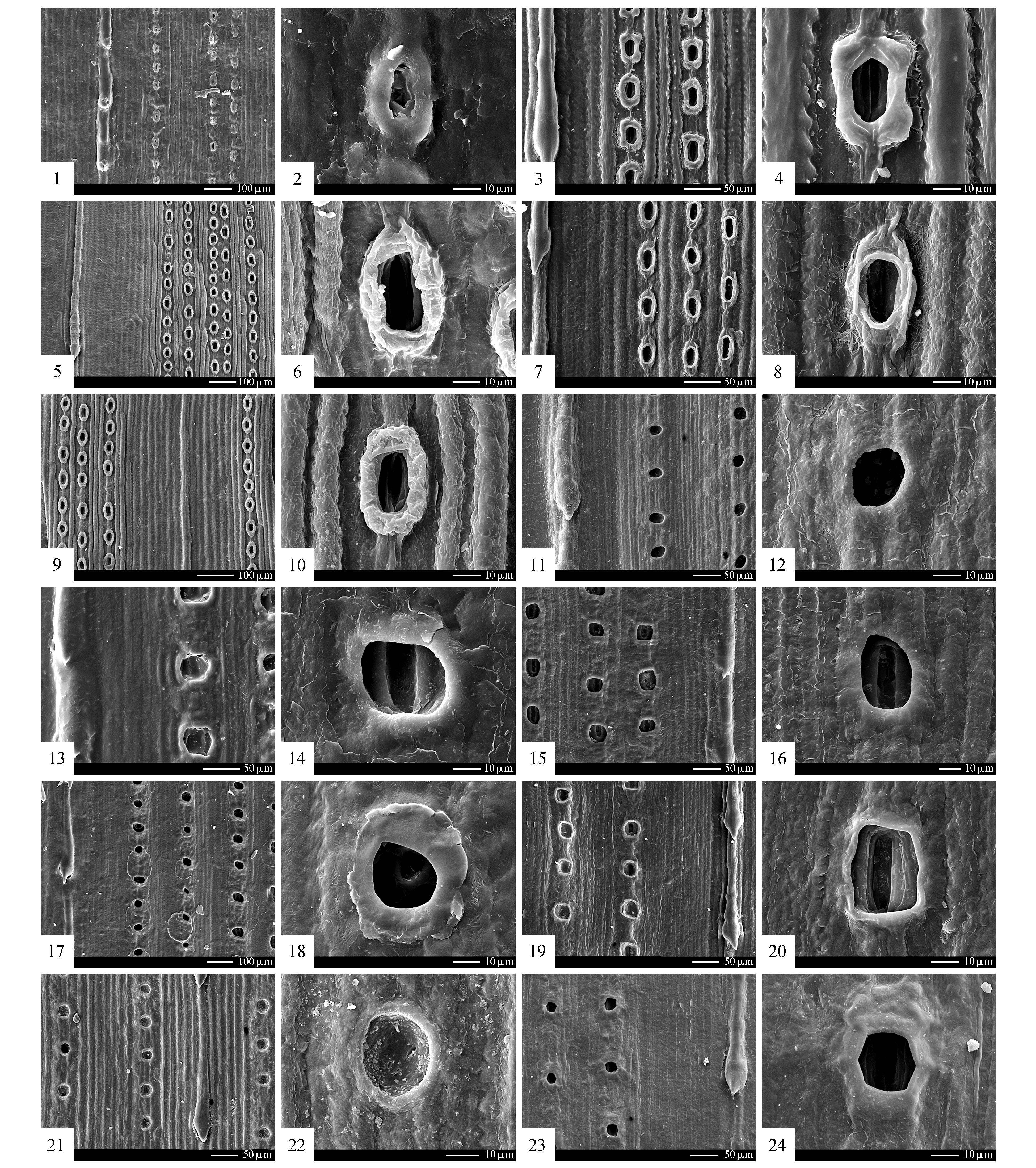 Plate Ⅲ Scanning electron micrographs of the outer surface of the cuticles1~2.Pinus bungeana;3~4.P. fenzeliana;5~6.P. kwangtungensis;7~8.P. armandii;9~10.P. parviflora;11~12.P. massoniana; 13~14.P. thunbergii;15~16.P. taiwanensis;17~18.P. elliottii;19~20.P. taeda;21~22.P. echinata;23~24.P. palustris