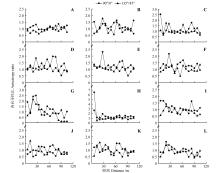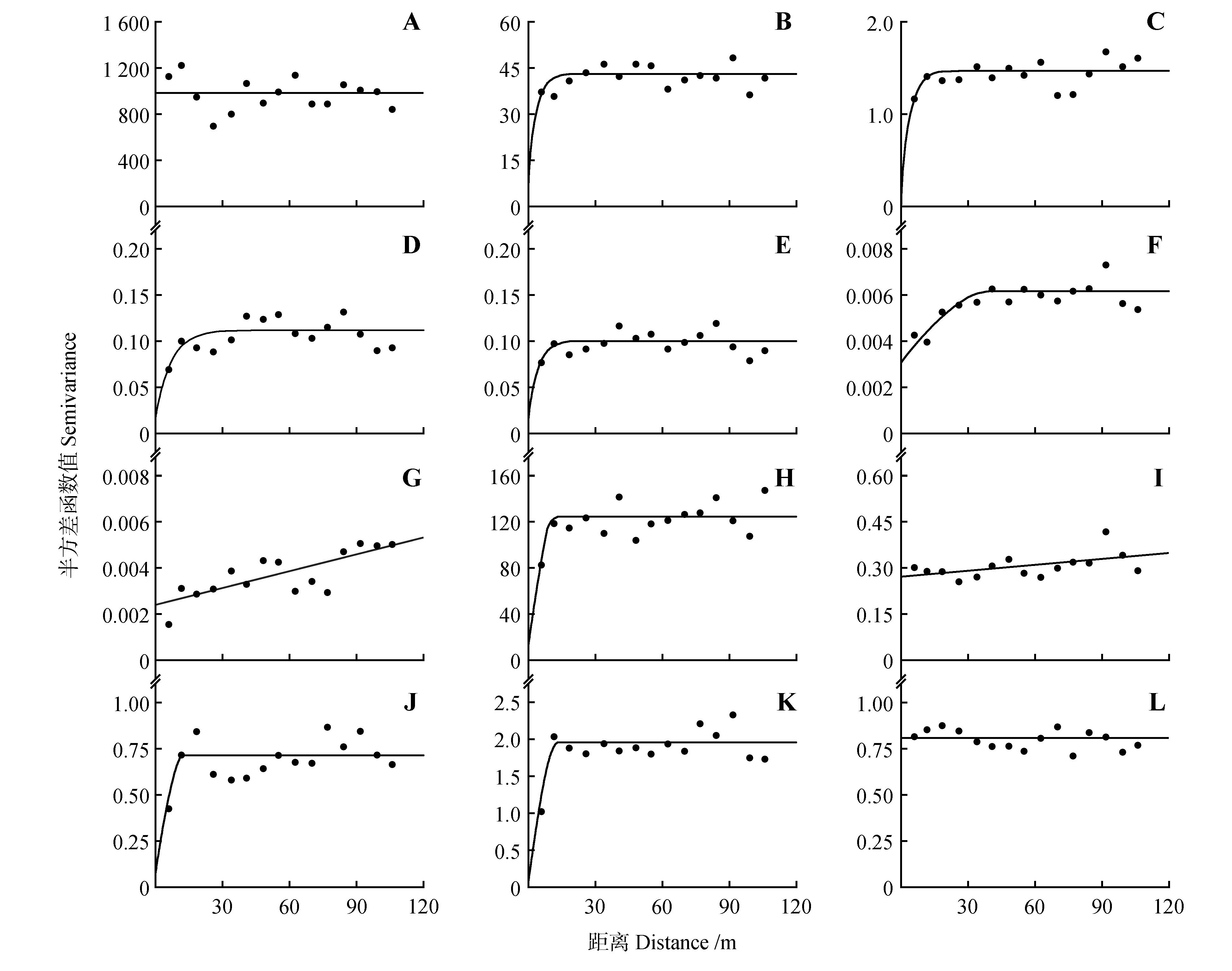 Semi-variograms of phenotypic fruit and seed traits of M. wilsoniiA.Fruit length;B.Fruit width;C.Fruit shape index;D.Fruit fresh mass;E.Fruit dry mass;F.Follicel longitudinal diameter;G.Follicel transverse diameter;H.Follicle abortion rate;I.Seed longitudinal diameter;J.Seed transverse diameter;K.1 000-seed mass;L.Seed abortion rate