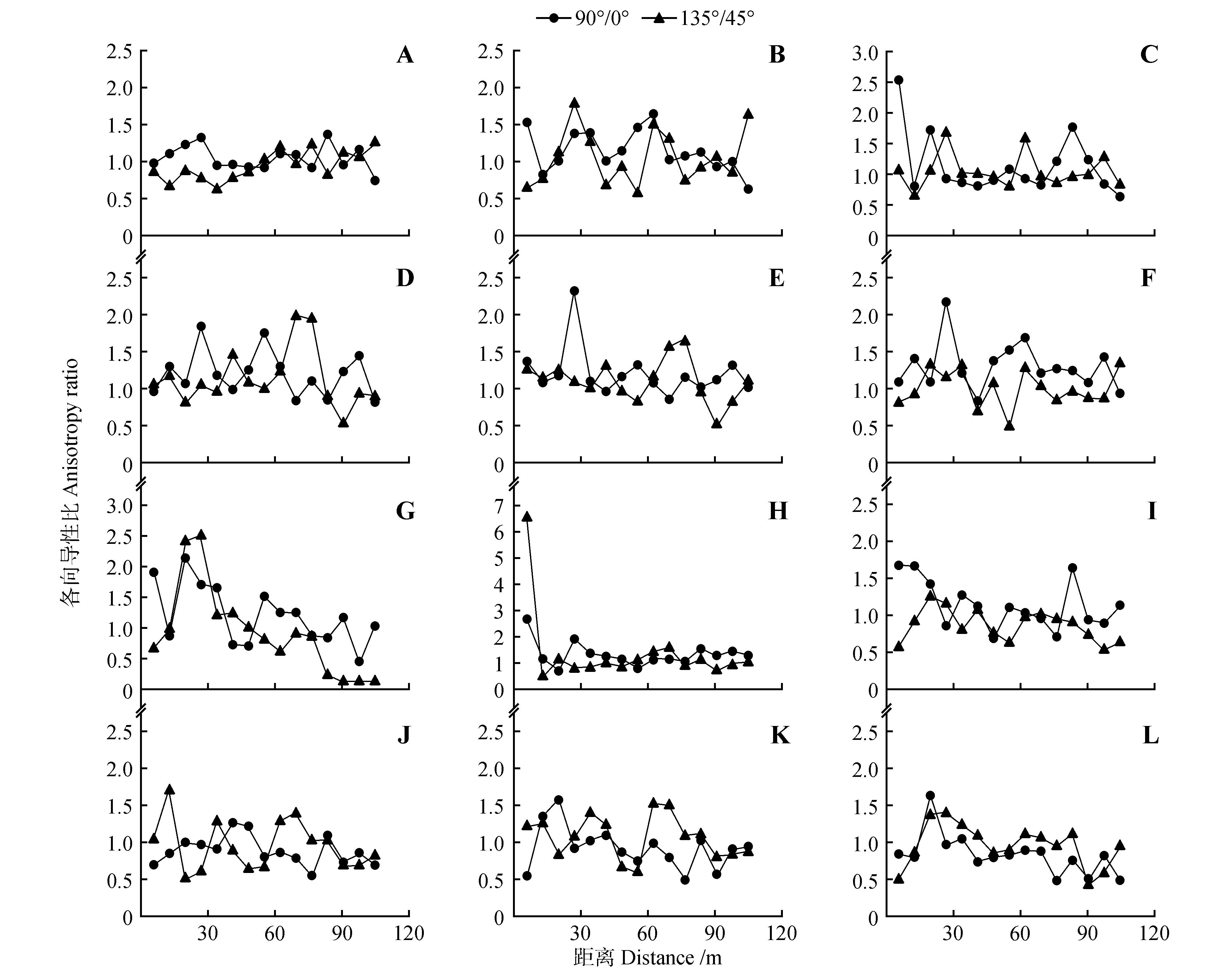 Anisotropy ratios of phenotypic fruit and seed traits of M. wilsoniiA.Fruit length;B.Fruit width;C.Fruit shape index;D.Fruit fresh mass;E.Fruit dry mass;F.Follicel longitudinal diameter;G.Follicel transverse diameter;H.Follicle abortion rate;I.Seed longitudinal diameter;J.Seed transverse diameter;K.1 000-seed mass;L.Seed abortion rate