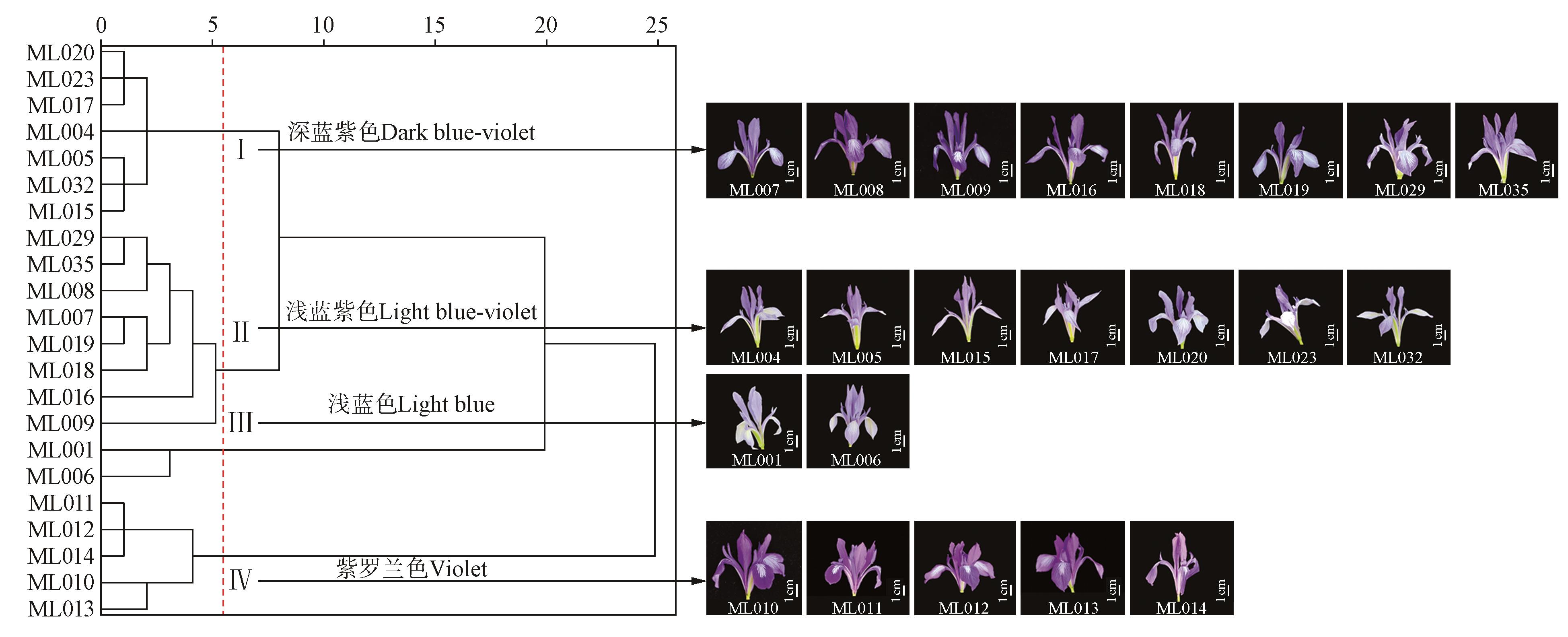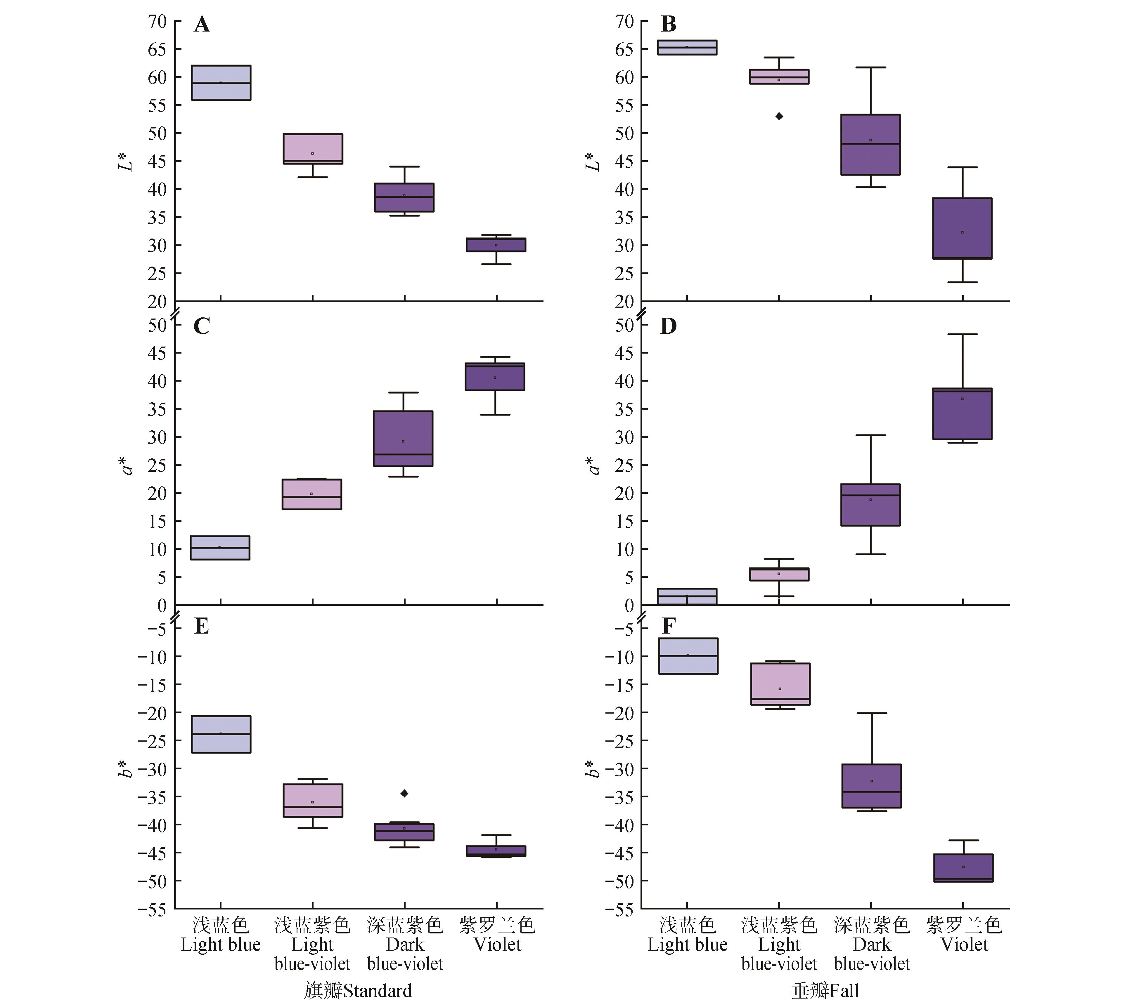 浅蓝紫色 Light blue-violet | 5.16±0.08b | 0.95±0.03b | 5.13±0.09bc | 0.72±0.03b | 6.35±0.17a | 0.33±0.02a | 5.70±0.05b | 26.96±0.71a |