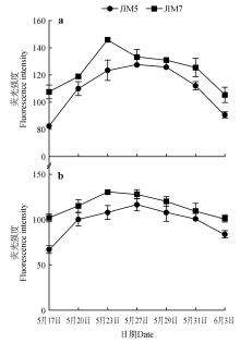 Changes of cellulose fluorescence intensity in che-stnut female flowers at different stagesa.Changes of cellulose fluorescence intensity in transverse section of chestnut female flowers at different stages;b.Changes of cellulose fluorescence intensity in longitudinal section of chestnut female flowers at different stages.