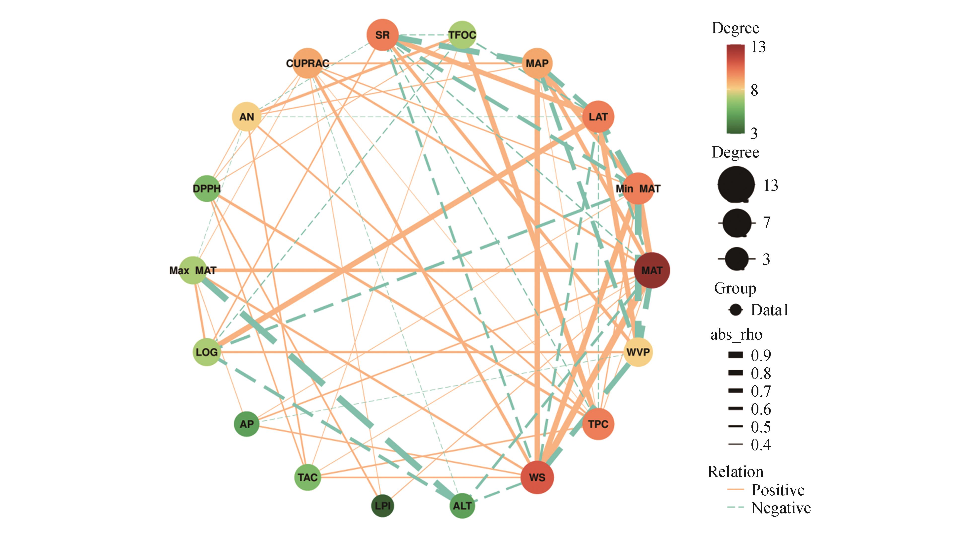 Network diagram of correlation between polyphenol content and antioxidant activity in lily bulbs and environmental factorsDPPH. DPPH free radical scavenging ability;CUPRAC. Copper ion reduction ability;LPI. Inhibition of lipid peroxidation;TPC. Polyphenol content;TFOC. Flavonoid content;TAC. Total anthocyanin content;AN. Available nitrogen;AP. Available phosphorus;LOG.Longitude;LAT. Latitude;ALT. Altitude;WS. Wind speed;WVP. Water vapor pressure;MAP. Average annual precipitation;MAT. Annual average temperature;Max MAT. Annual maximum temperature;Min MAT. Annual minimum temperature;SR. Annual average solar radiation.