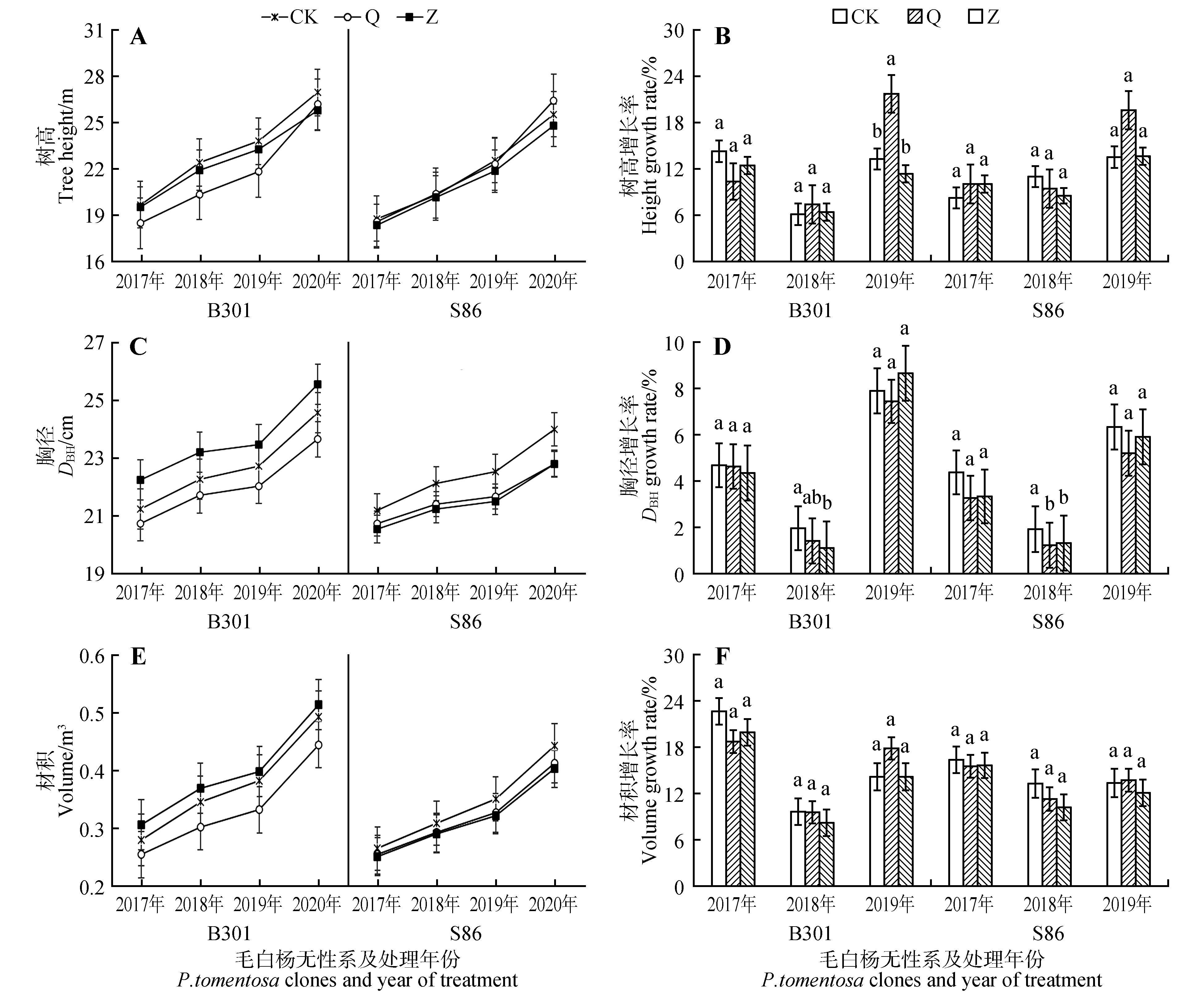 Effects of different pruning on the growth of 10-year-old triploid P.tomentosaA,C,E were the interannual changes of height,DBH and volume of triploid P.tomentosa respectively;B,D,F were the ΔH,ΔD and ΔV of P.tomentosa in each year respectively;Different lowercase letters indicated significant difference between pruning treatments(P<0.05);the same as below
