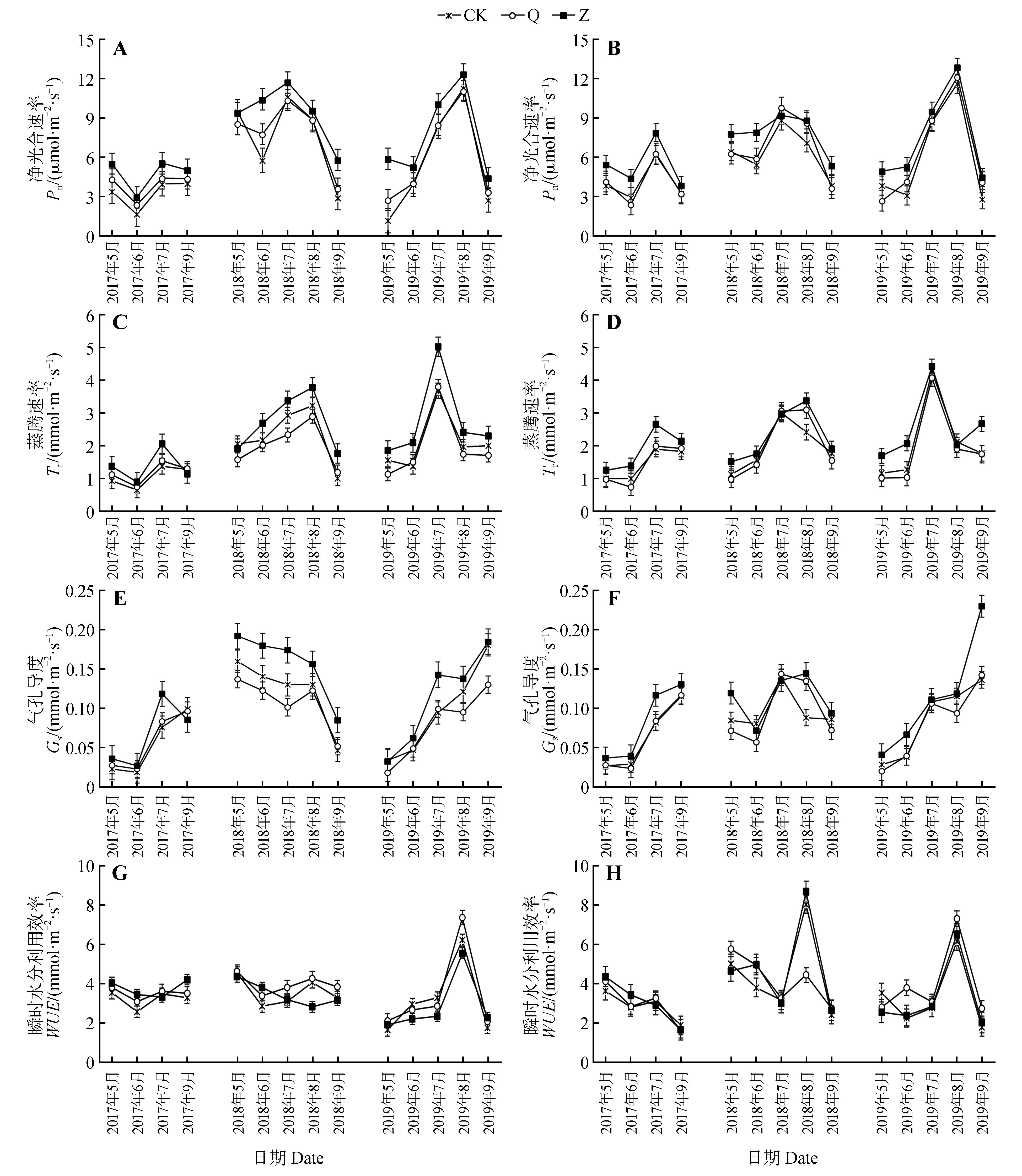 差异来源 Source of variance | 净光合速率 Pn | 蒸腾速率 Tr | 气孔导度 Gs | 瞬时水分利用效率 WUE |
