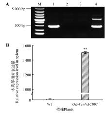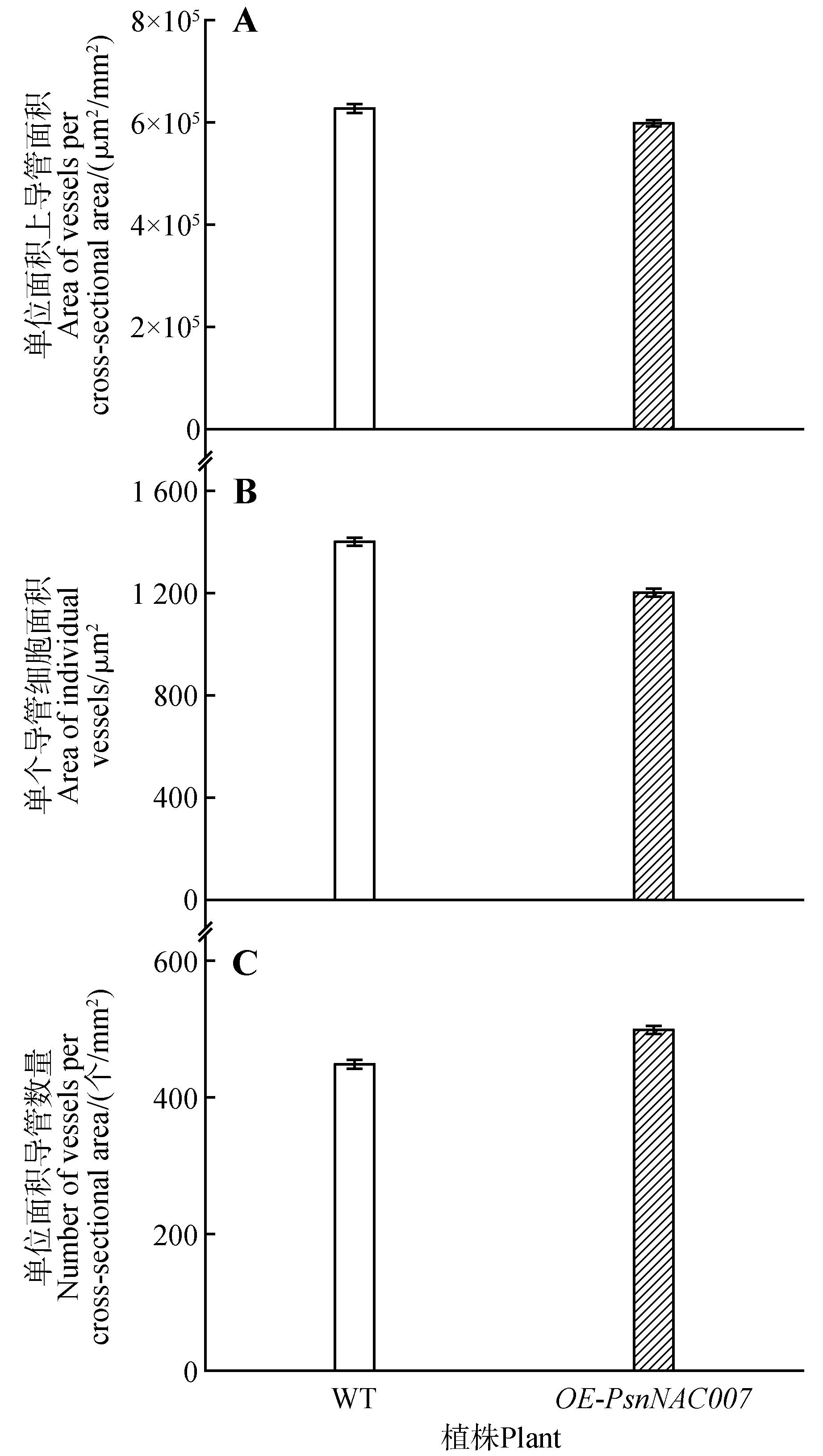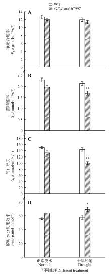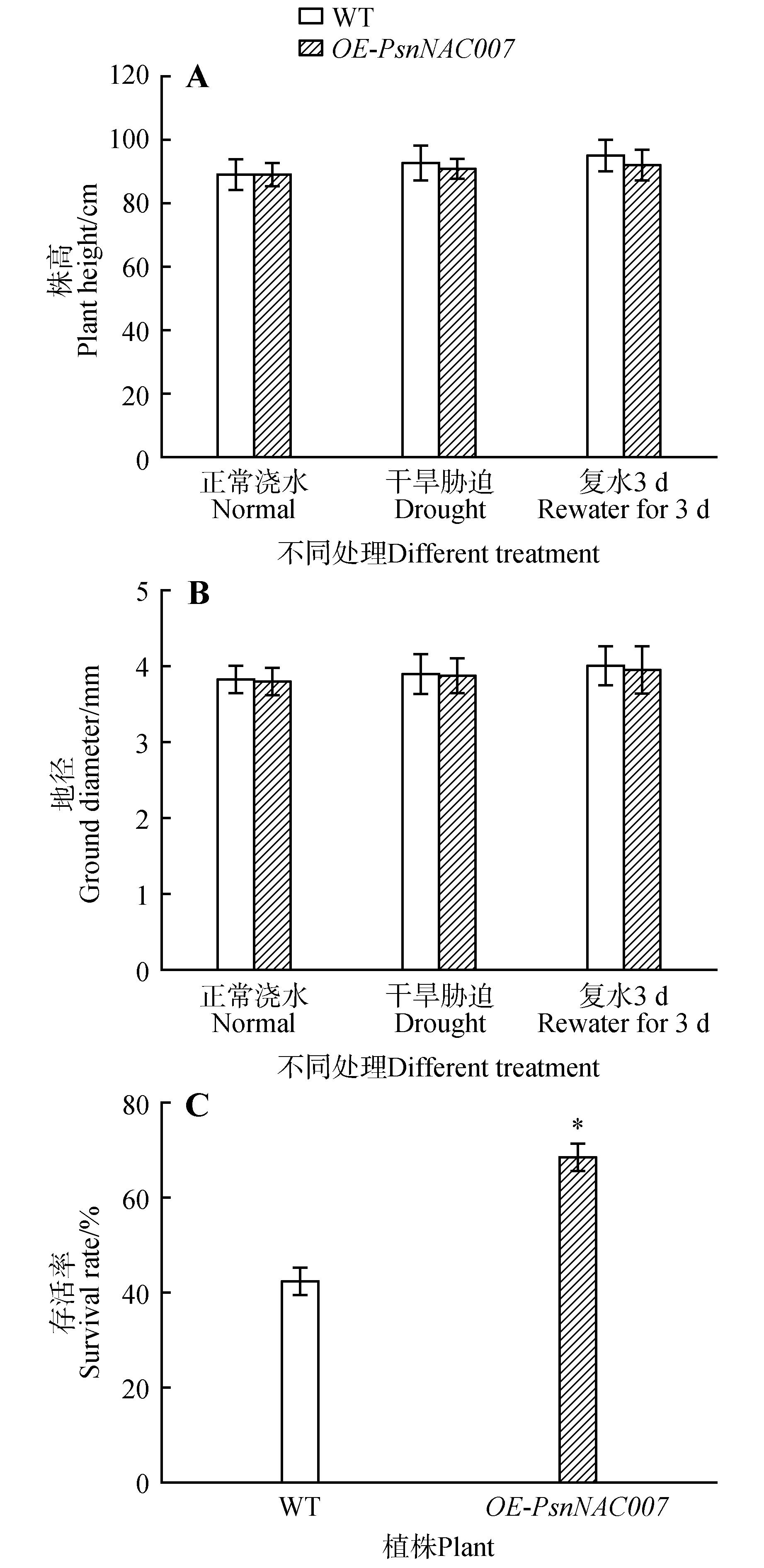 Populus simonii×P. nigra is a fast-growing and cold-tolerant tree species with elite wood properties in northeast China. In order to produce a new forest germplasm with more widely planting and improved drought tolerance, this study successfully generated transgenic P. simonii×P. nigra using PsnNAC007, a key drought response transcription factor gene. Growth characteristics, drought tolerant ability, net photosynthetic rate(Pn), transpiration rate(Tr), stomatal conductance(Gs), water conductance, cell morphology and wood components of overexpressed PsnNAC007 transgenic plants were analyzed respectively. The results showed that there was no significant difference in growth between transgenic and wild-type plants, but drought survival rate was increased by 26.15%. Under drought condition, transgenic plants exhibited reduced Cleaf and Tr, improved water use efficiency, and lower water conductance loss. Anatomical analysis showed that the overexpression of PsnNAC007 led to more and smaller stem xylem vessels, which were conducive to the continuous and efficient water transport in plants under drought conditions. Based on wood components analysis, lignin deposition in stems of transgenic plants was increased significantly, and monosaccharides that constituted cellulose and hemicellulose showed no significant change.